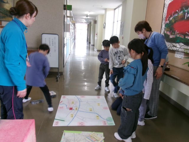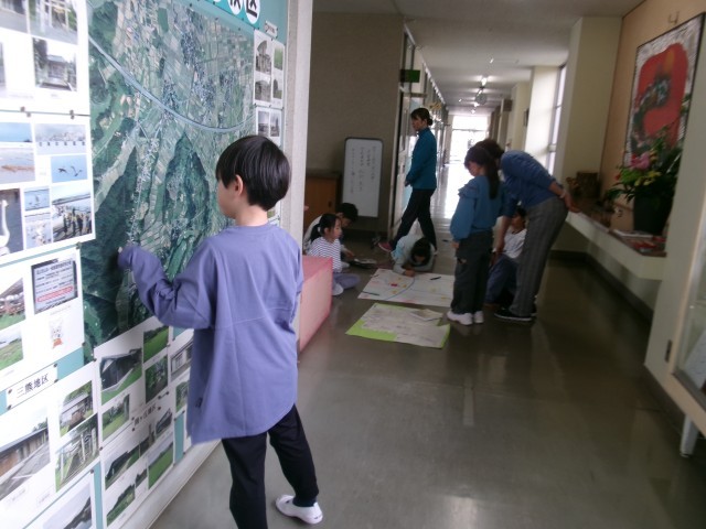 社会科では、地域の写真から、どこに何があるかを、先生手作りの地図に書き込みました。