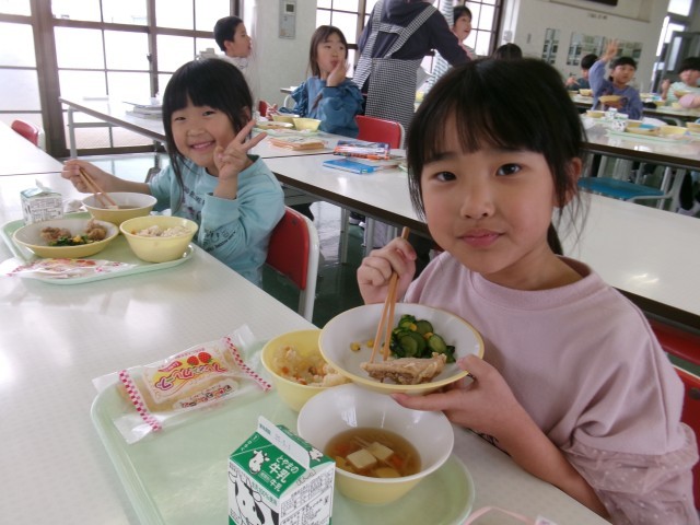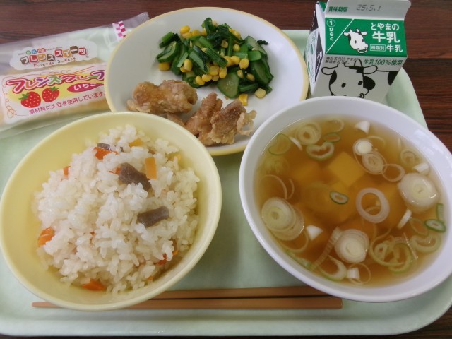 ちらし寿司、牛乳、鶏肉のから揚げ、コーン和え、すまし汁、お祝いデザート(いちごのクレープ)です。