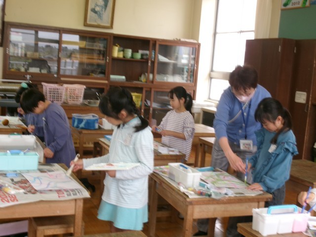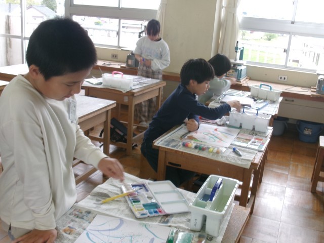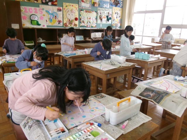 筆や絵の具を思い思いにつかって、「ゆめもよう」を描いています。