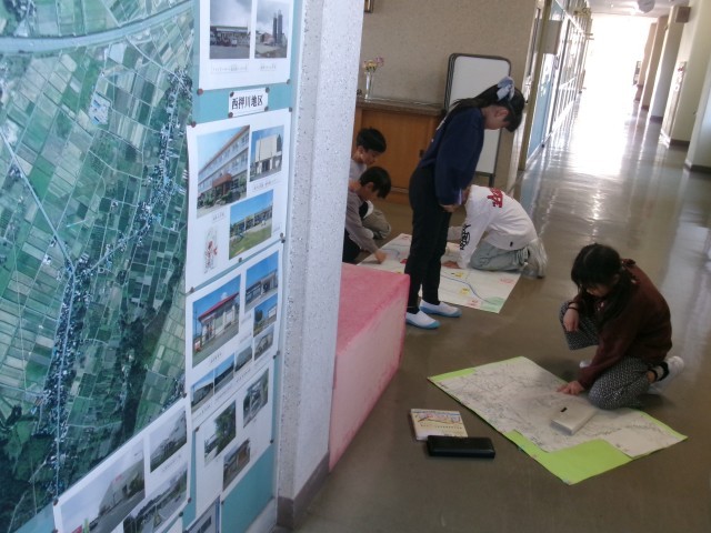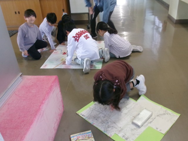 先生手書きの校区地図に、自分たちの家や周辺の施設を書き込んでいます。