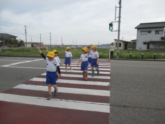 左右を確認し、手を挙げて、安全に交差点を渡ることができました。
