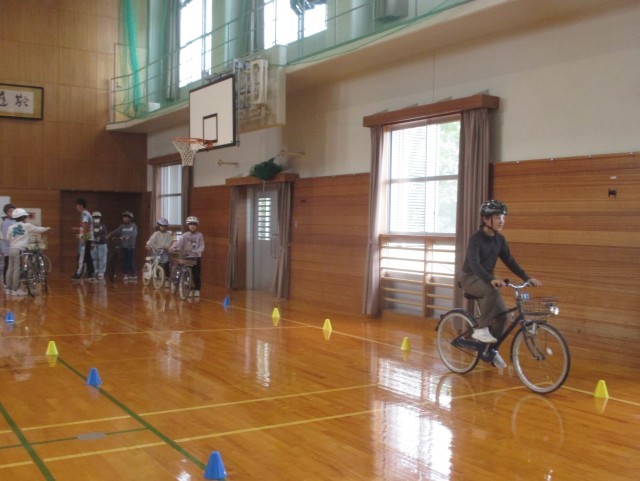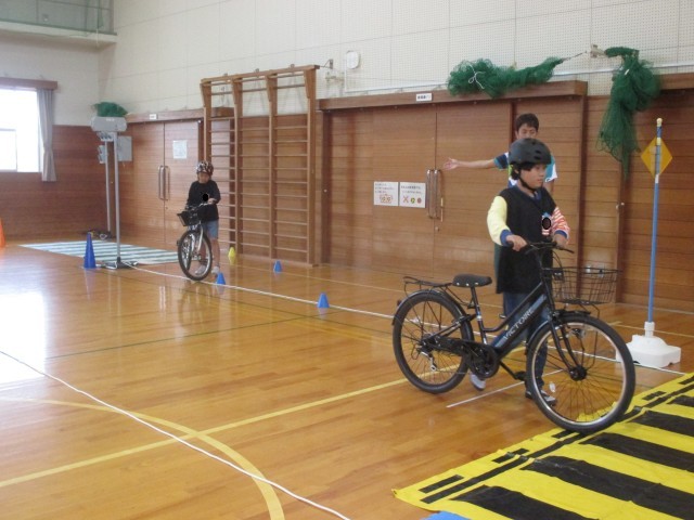 「ぶたはしゃべるら」を合い言葉に自転車点検を行うことを教わり、交差点や一旦停止の道路を安全に渡る練習をしました。