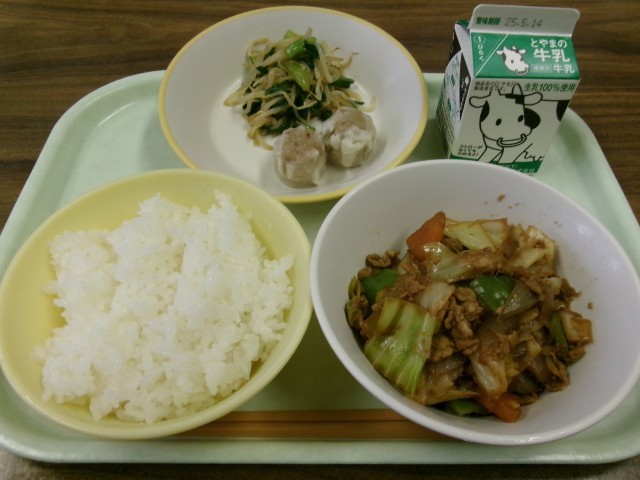 今日の献立は、ごはん、牛乳、肉シューマイ、香味和え、回鍋肉です。