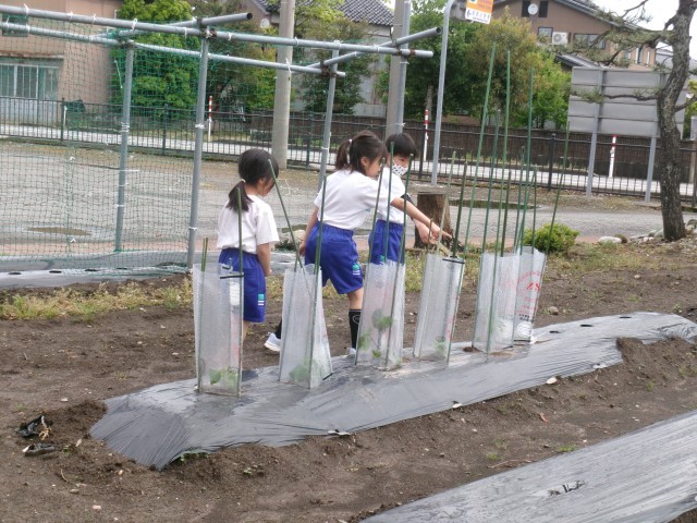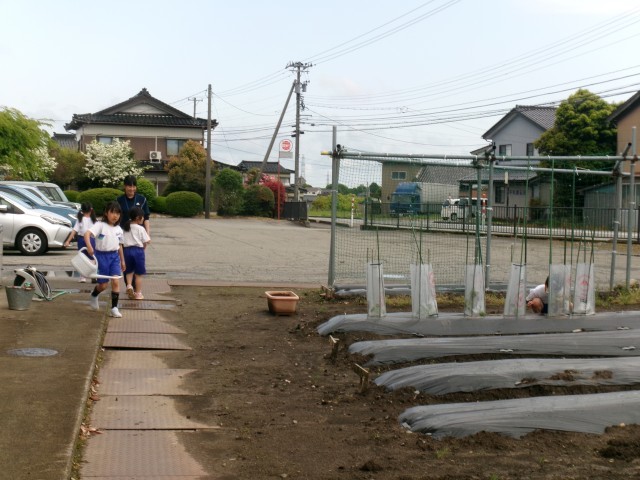 苗の様子を見て、水やりをやめていました。