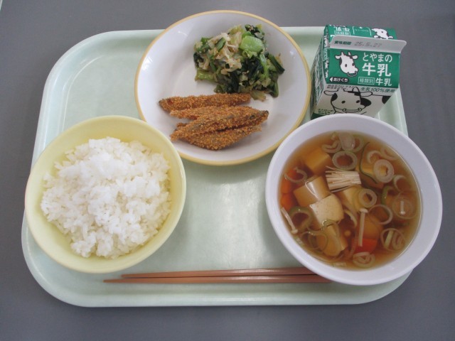 今日の献立は、ごはん、牛乳、きびなごのさくさく揚げ、ごまびたし、白玉汁です。