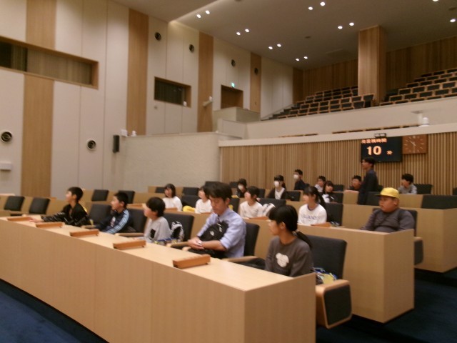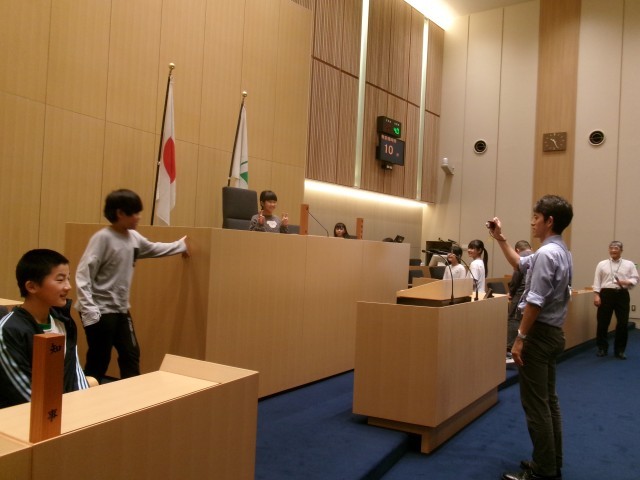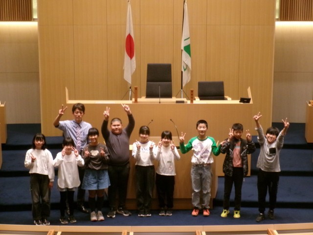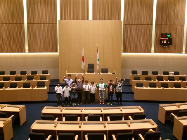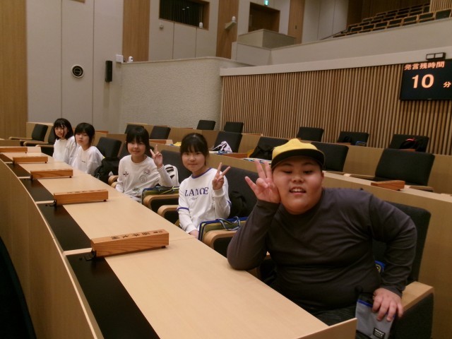 県知事や議員さんのいすに座らせていただき、ちょっとうれしい子供たちです。