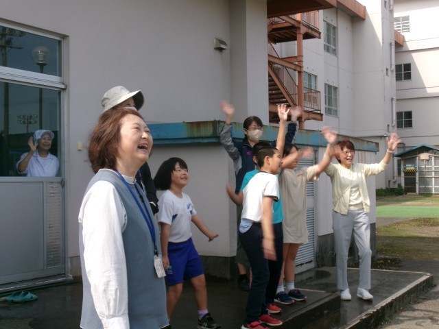 4年生が、最後までバスを見送ります。