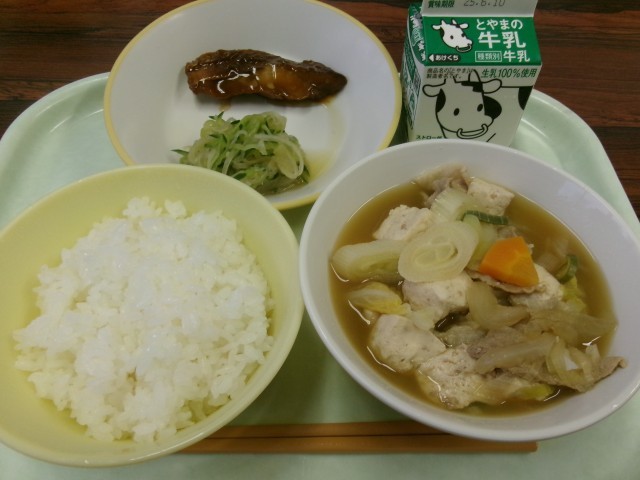 今日の献立は、ごはん、牛乳、赤魚の照り焼き、酢の物、肉豆腐です。
