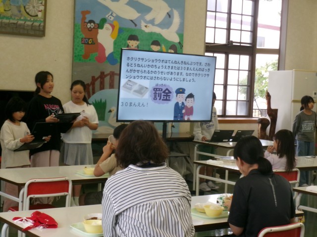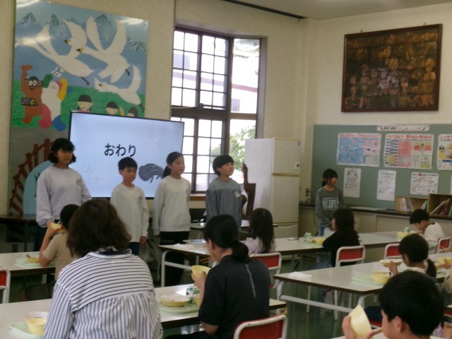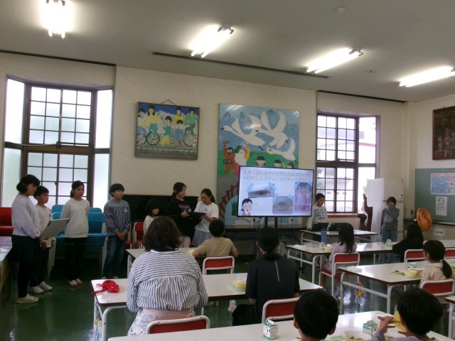 給食中、5年生からホクリクサンショウウオのお世話や調べたこと、情報委員会からおすすめの本の紹介がありました。