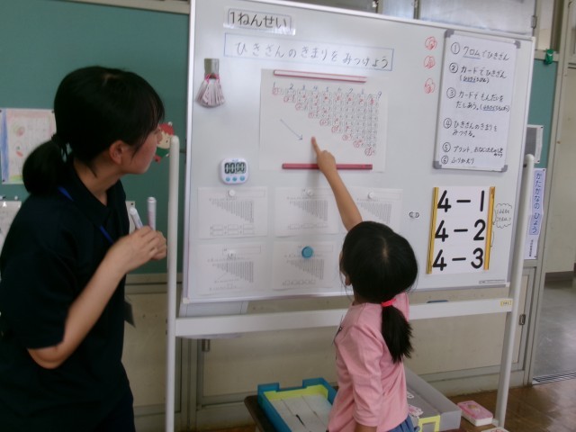 1年生は「ひきざんのきまりをみつけよう」、2年生は「100より大きい数を表した数直線の読み方を考えよう」の学習です。