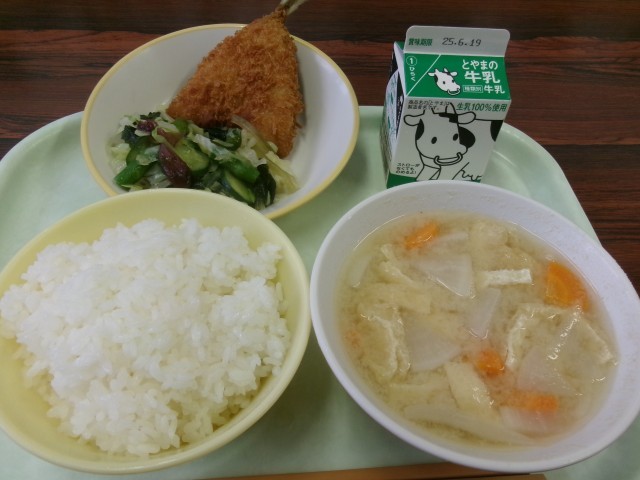 今日の献立は、ごはん、牛乳、あじフライ、海藻サラダ、みそ汁です。