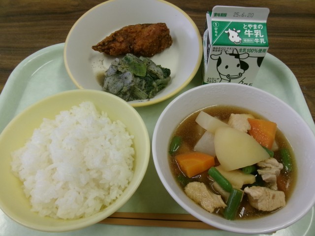 今日の献立は、ごはん、牛乳、ふくらぎの竜田揚げ、よごし、大和煮です。