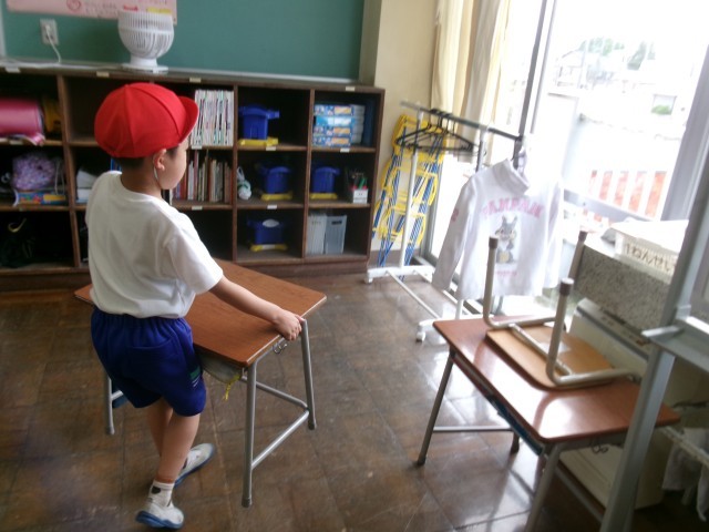 クレヨンで汚れた手を洗ったり、掃除がしやすいように机を運んだり。