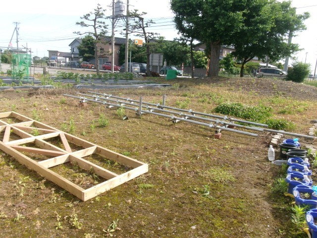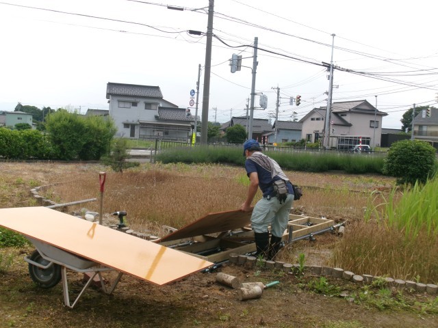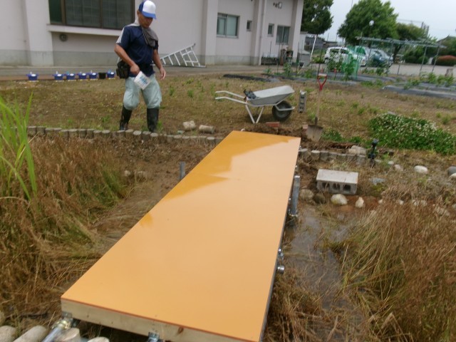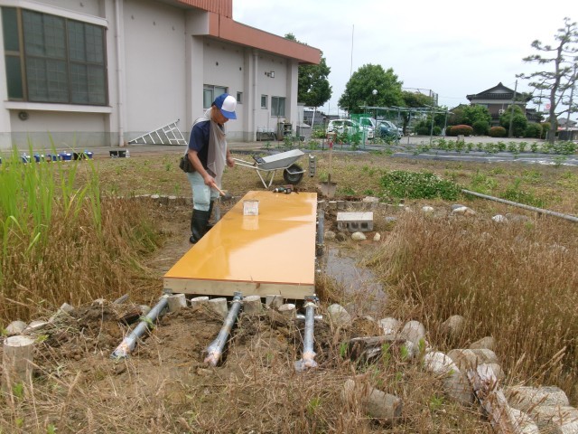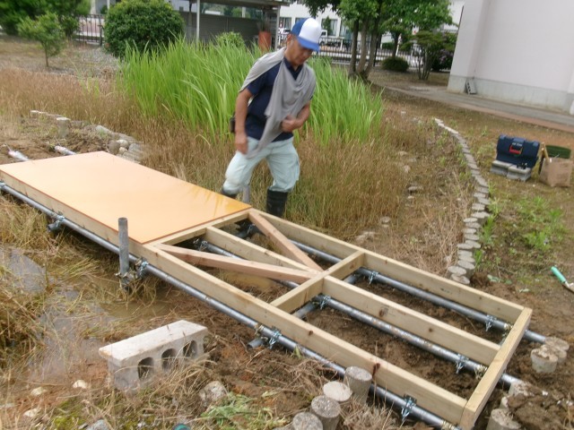 用務員さん力作の「橋」が、ビオトープの中にある「島」に架かろうとしています。
