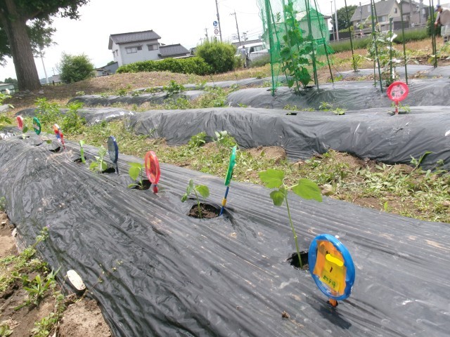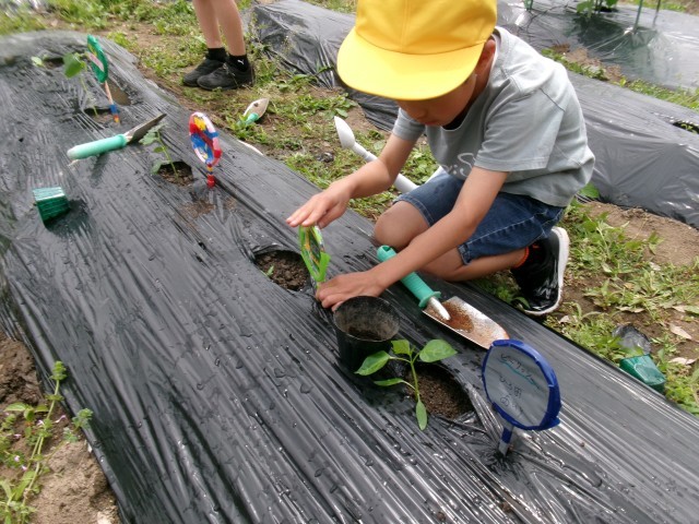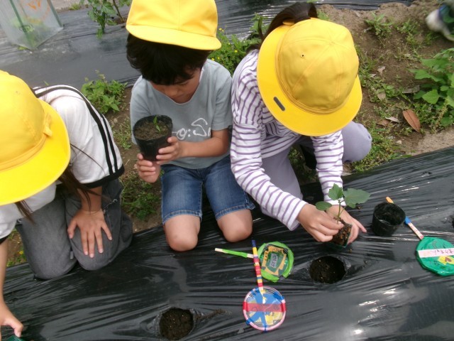 みんなで学校農園に植えに行き、先日つくった「プラカード?」を刺しました。