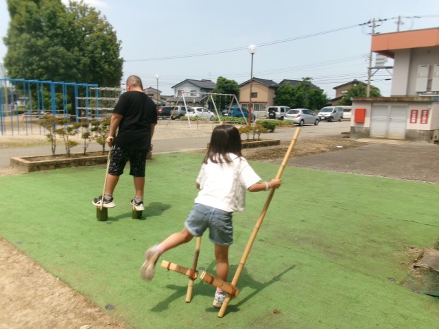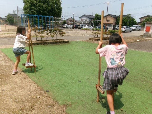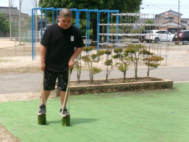 竹馬、竹ぽっくりの使い方の説明があり、フッ素洗口で昼休みが短い中、早速、挑戦する子供がいました。