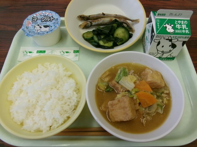 献立は、ごはん、牛乳、ししゃもの米粉揚げ、わかめの中華和え、厚揚げのみそ炒め、ヨーグルトです。
