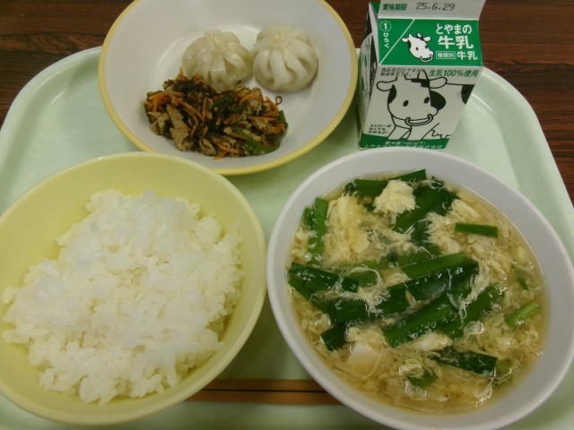 今日の献立は、ごはん、牛乳、えび包子、もずくのチャプチェ、にら玉汁です。