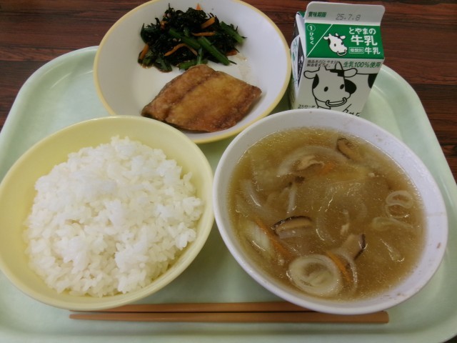 今日の献立は、ごはん、牛乳、さばのレモン味、ひじきのごま和え、冬瓜スープです。