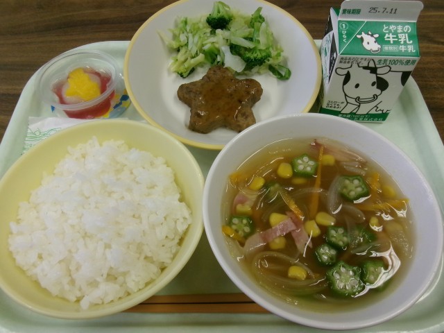 ごはん、牛乳、星形ハンバーグ、そえ野菜、天の川スープ、七夕ゼリーです。