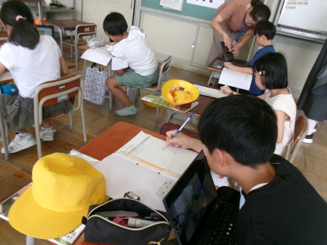 暑いので、学校農園で写真を撮り、教室で記入します。