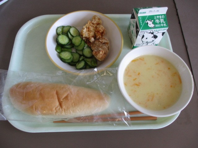今日の献立は、コッペパン、牛乳、コーンポタージュ、フライドチキン、アスパラサラダです。
