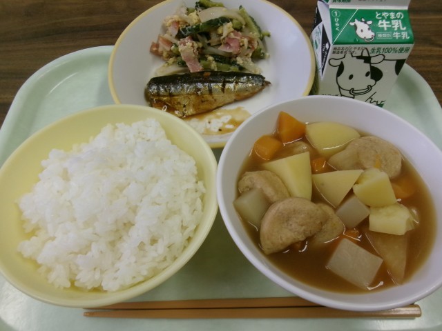 今日の献立は、ごはん、牛乳、いわしの梅煮、ベーコンとゴーヤの卵炒め、炊き合わせです。