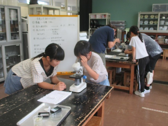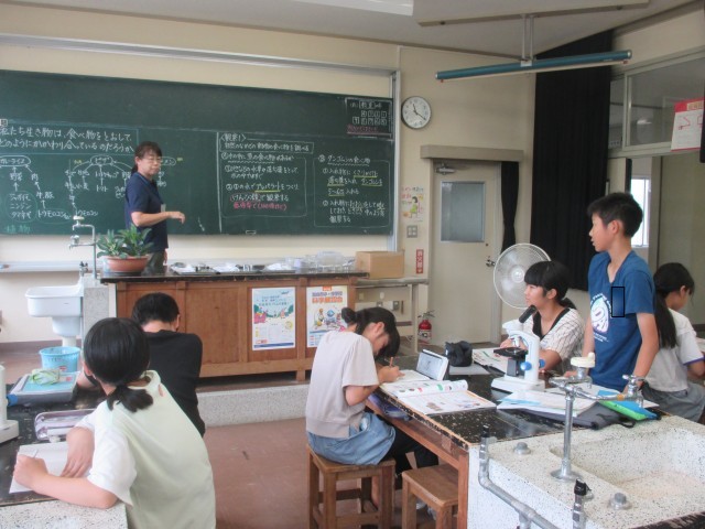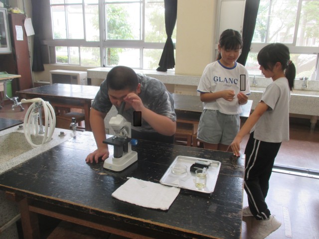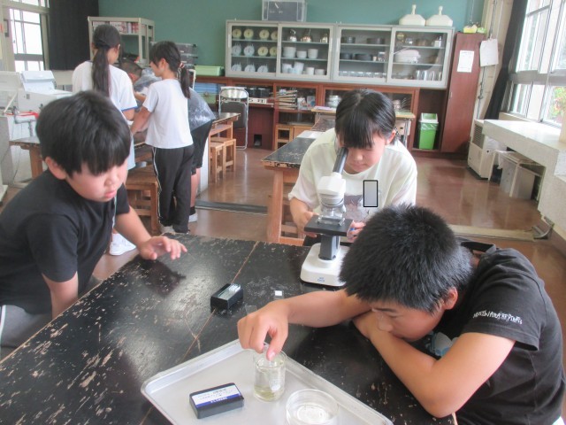 生き物と食べ物の関わりについて、最初に自分たちの大好きなメニュー(ピザ、ラーメン等)をとおして話し合いました。その後、水の中の生き物が食べる物を顕微鏡を使って観察しました。みんな夢中になって、見入っていました。