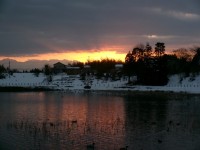 朝焼けが美しい田尻池です。今朝は冷え込みが厳しく、池の北側は凍っていました。白鳥...