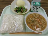 今日の献立は、牛乳、ソフト麵の肉みそ、ビーンズサラダ、りんごです。 少し甘めの...