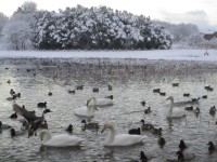 白い雪と朝日に白鳥の白が映える美しい朝です。けさの飛来数は18羽でした。田尻池付...