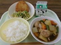 今日の献立は、ごはん、牛乳、あじフライ、昆布和え、関東だきです。 ふっくらした...