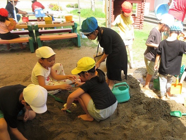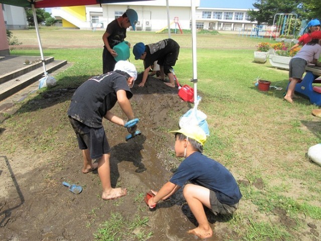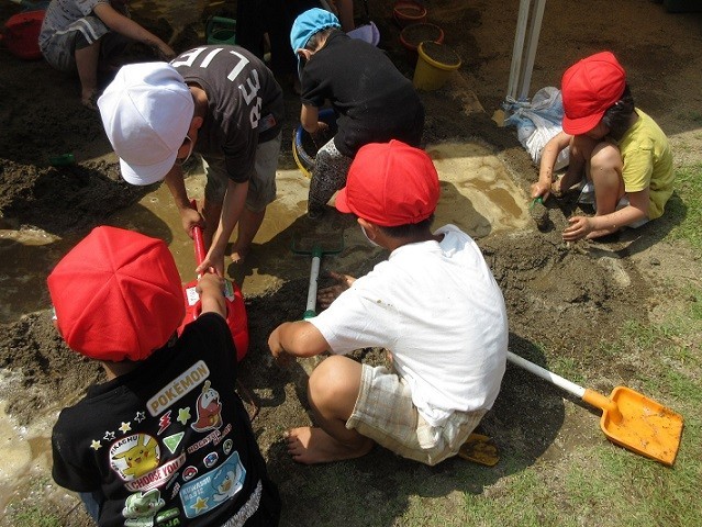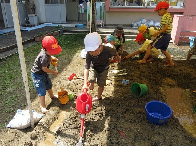 11日(金)は、2度目の交流です。しかも、幼稚園の砂場で遊びました。子供たちは、「前よりもっと仲よしになるよ」「学校の砂場と幼稚園の砂場の砂を比べてみよう」など、それぞれ目当てをもって活動しました。1回目より声を掛け合い、しかも活動もダイナミックになり、思う存分友達や砂、そして水と触れ合いました。
