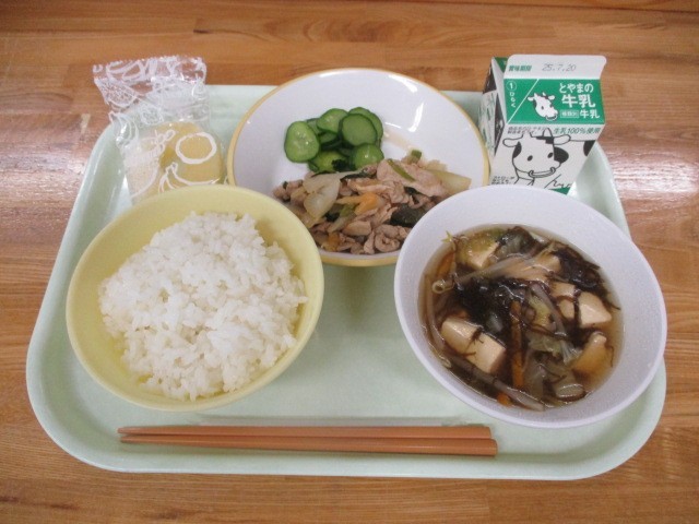 7月14日(月)の給食 公開日 2025/07/14 更新日 2025/07/14 学校からのお知らせ きょうの給食は、ごはん、牛乳、豚肉キムチ丼、きゅうりもみ、豆腐ともずくのスープ、冷凍パインです。栄養満点の豚肉のビタミンB1、さっぱりとしたきゅうり、つるっとしたもずく、涼しげな冷凍パインなど夏にぴったりのメニューです。
