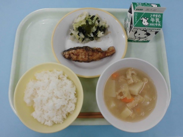 今日の給食は、ごはん、牛乳、ふくらぎのかば焼き、酢の物、みそ汁です。