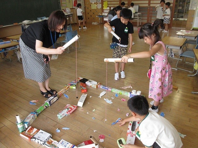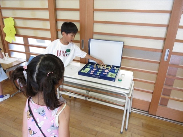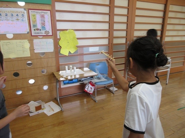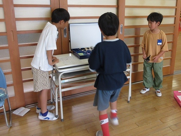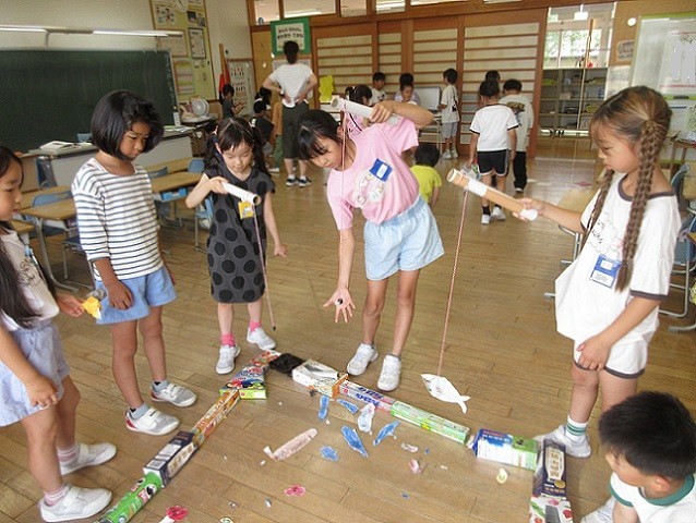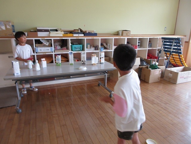イベント係が企画した「夏のフェスティバル」を行いました。学活の時間と自主タイムを使って、相談し、協力してつくり、ルールを話合い、準備を進めてきました。3人一組で一つの屋台(手づくりゲーム)を出すので、5つの屋台ができました。担任も一つ提示し、計6つの屋台を子供たちが順序よく店番をして開きました。的当てやボーリング、輪投げ等どれも楽しくて、大盛り上がりでした。途中で校長先生や2年生も参加し、一層やりがいを感じていました。1学期にこれだけ計画的に友達と協力して、楽しい会を開くことができる子供たちの実行力には、驚かされました。