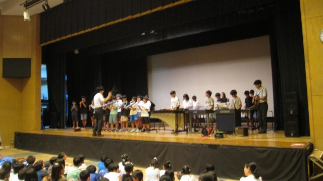 6年生は、橋まつりのドリーム演奏会に出演しました。大勢の観客の皆さんの前で、「ラバーズコンチェルト」と「栄光の架橋」の合奏を披露しました。その後、水橋学園で一緒になる他校の演奏を鑑賞しました。