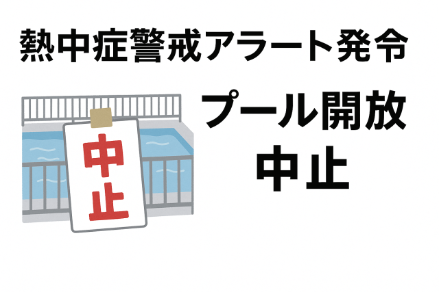 8月1日(金)は、熱中症警戒アラート発令されるため、プール開放を中止します。