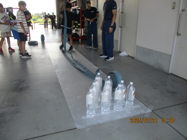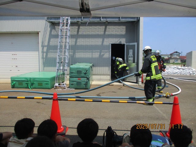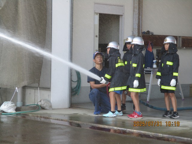 7月30日に水橋消防署で行われたB・F・C防火のつどいに5名の代表児童が参加しました。放水や通報、消火等の体験をしたり、防御訓練を間近で見せていただいたりしました。