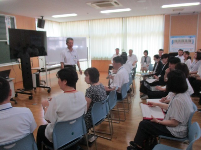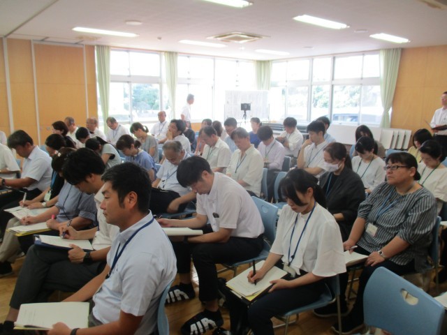 水橋学園で一緒になる2中学校、4小学校、そして幼稚園の先生たちが参集し、合同研修会を行いました。講師として、富山市教育委員会の宮口教育長をお招きし、ご講演いただきました。講演ではグループ討議もあり、子供たちに培いたい資質・能力を育むために、今後どのような教育活動が必要かなど、校種の枠を超えて熱心に話し合いました。