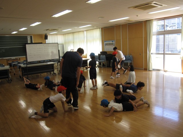 熱中症警戒アラートが出ているため、冷房の効いたランチルームで体育をしています。「どうぶつランドにしゅっぱつだ!」という表現遊びに取り組んでいました。
