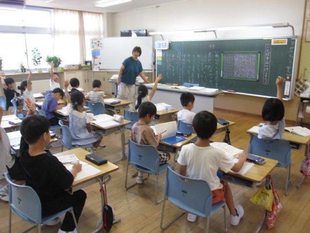 国語の時間です。黒板にたくさんの言葉が書かれていました。文字が碁盤目状に書かれている中から、たて・よこ・ななめで言葉を見付ける活動です。どの子供も意欲的です。自分で問題を作ってみるのもおもしろいですね。