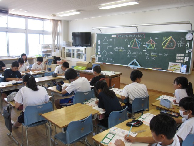 算数「図形の角を調べよう」の学習です。三角形の角の和が180度となることを使って、五角形や六角形などの多角形についても調べてみました。
