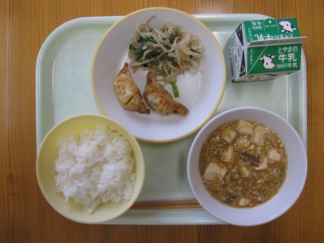 きょうの給食は、ごはん、牛乳、あげ餃子、香味和え、麻婆豆腐です。