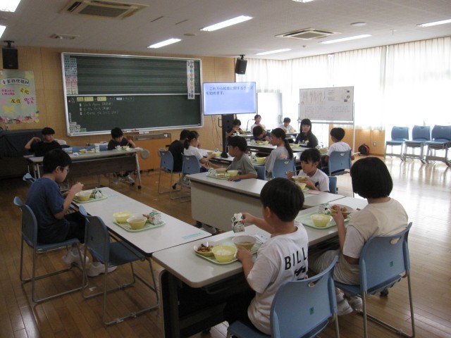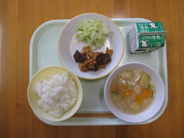 きょうの給食は、鶏肉とレバーの甘からめ、添え野菜、五目みそ汁です。きょうは青団1~3班がランチルームでファミリー会食を行いました。