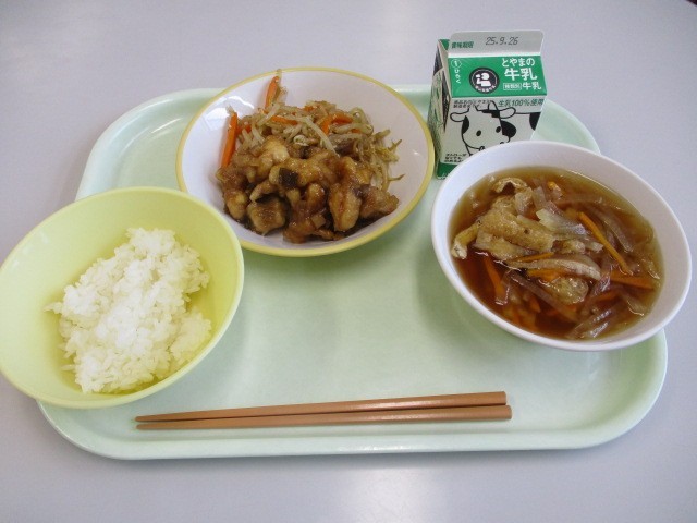 今日の給食は、ごはん、牛乳、もやしのナムル、鶏肉のねぎソースかけ、沢煮椀(さわにわん)です。