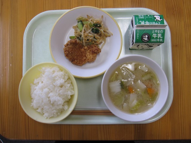 きょうの給食は、ごはん、牛乳、豚肉の香り揚げ、いり大豆和え、つみれ汁です。