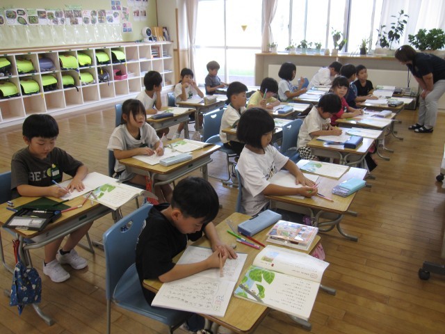 国語の学習です。「やくそく」に出てくる3びきのあおむしたちの様子を考えます。ノートにも思ったことをたくさん書けるようになってきました。