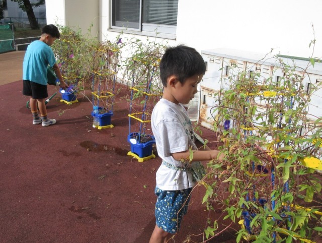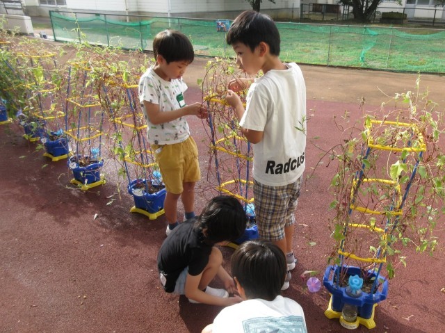 暑い夏を乗り越えたあさがおが、種を実らせています。毎朝、種がいくつとれるかを楽しみに、みんなで声をかけ合って種を見つけています。多い子供は、100個を超えたようです。