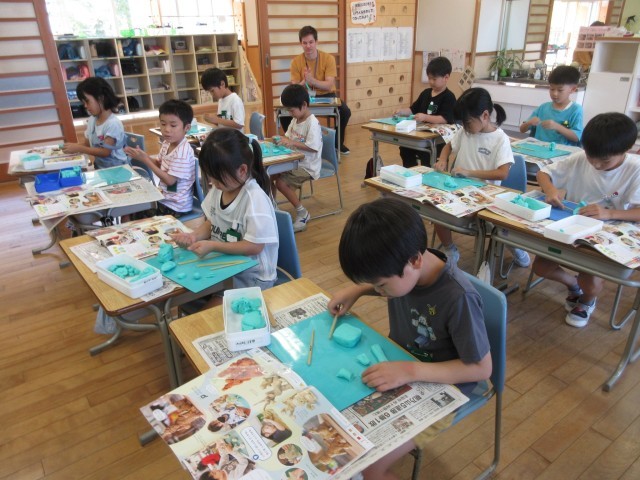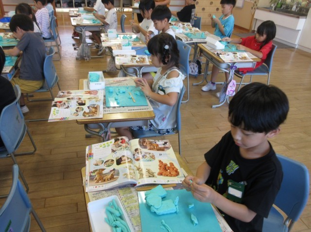 図画工作科「いっしょにお散歩」の学習では、粘土を使って、「どんな生き物」と「どこを」、「どんなふうに」お散歩したいかを想像してつくっています。「海の中を大きなエイといっしょにお散歩したいな」「かわいい恐竜と広い草原をお散歩したいな」など、どんどん想像を広げ、楽しみながらつくっています。どんなお散歩がならぶか、楽しみです。